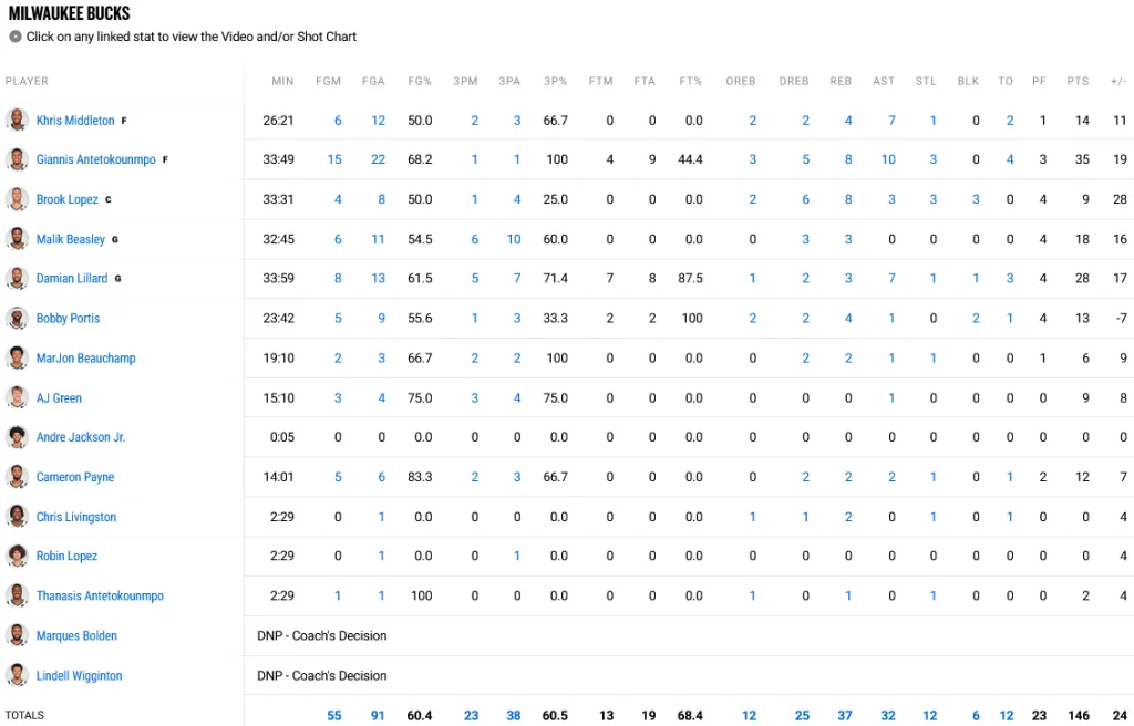Μεγάλος πρωταγωνιστής της αναμέτρησης ήταν ο Γιάννης Αντετοκούνμπο. Συγκεκριμένα, ο «Greek Freak» άγγιξε το triple double, αφού μέτρησε 35 πόντους (14/21 δίποντα, 1/1 τρίποντο, 4/9 βολές), 10 ασίστ, 8 ριμπάουντ και 3 κλεψίματα.