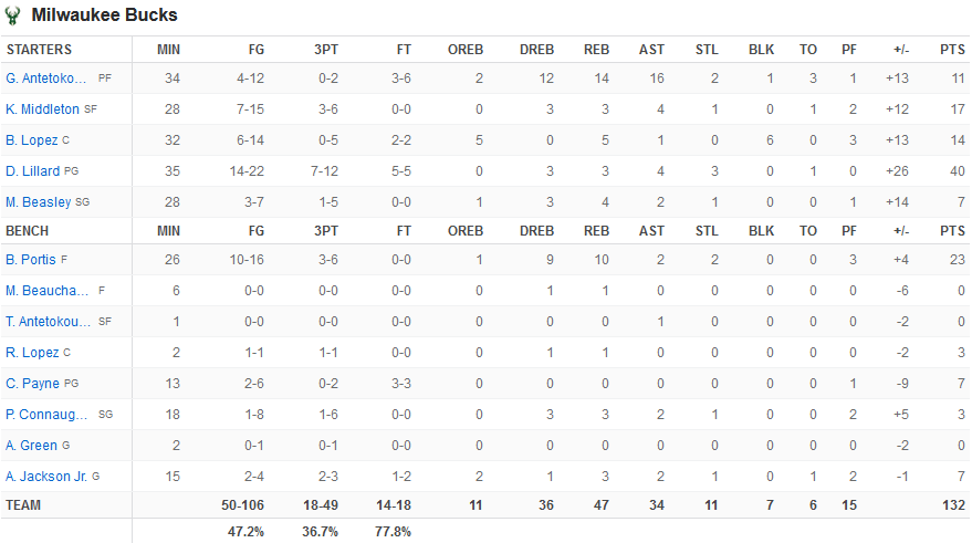 Κορυφαίος της αναμέτρησης ήταν ο Ντέμιαν Λίλαρντ με 40 πόντους (season-high) και 7/12 τρίποντα. Άξιος συμπαραστάτης του ήταν ο Μπόμπι Πόρτις με 23 πόντους και 10 ριμπάουντ, ενώ 17 πόντους πέτυχε ο Κρις Μίντλετον. Από την πλευρά του, ο Γιάννης Αντετοκούνμπο έμεινε μεν χαμηλά στο σκοράρισμα (11π.), αλλά μάζεψε 14 ριμπάουντ και κυρίως μοίρασε 16 ασίστ, σημειώνοντας ρεκόρ καριέρας.