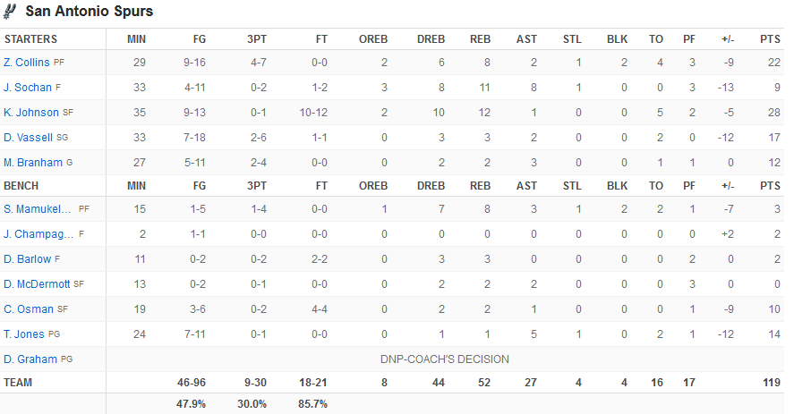 Για τα «Σπιρούνια, αντίθετα, ξεχώρισε ο Κέλντον Τζόνσον με 28 πόντους και 12 ριμπάουντ. Ακολούθησε ο Ζακ Κόλινς με 22 πόντους και 8 ριμπάουντ, με τον Ντέβιν Βασέλ να προσθέτει άλλους 17 πόντους.