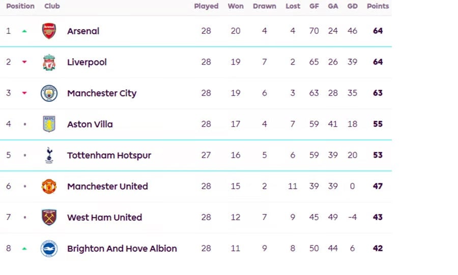 Έτσι, το θρίλερ στην κορυφή καλά κρατεί, με τις Άρσεναλ και Λίβερπουλ να είναι ισόβαθμες στους 64 βαθμούς. Ακριβώς πίσω τους, με 63 βαθμούς, είναι η Σίτι, 10 στροφές πριν την αυλαία του πρωταθλήματος.