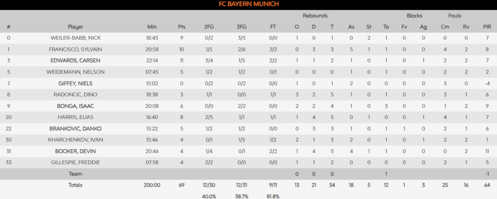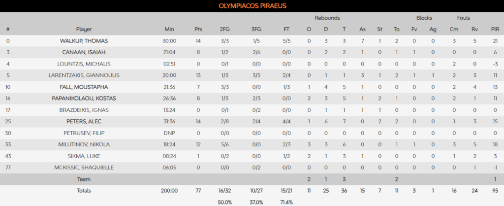 Κορυφαίοι της αναμέτρησης ήταν οι Τόμας Γουόκαπ (14π., 7ασ.) και Άλεκ Πίτερς (14π., 7ρ.). Από κοντά κι ο Γιαννούλης Λαρεντζάκης με 13 πόντους, ενώ 12 πόντους και 6 ριμπάουντ μέτρησε ο Νίκολα Μιλουτίνοφ. Για τους Βαυαρούς, από την άλλη πλευρά, ξεχώρισαν οι Έντουαρντς και Φρανσίσκο με 11 και 10 πόντους, αντίστοιχα.