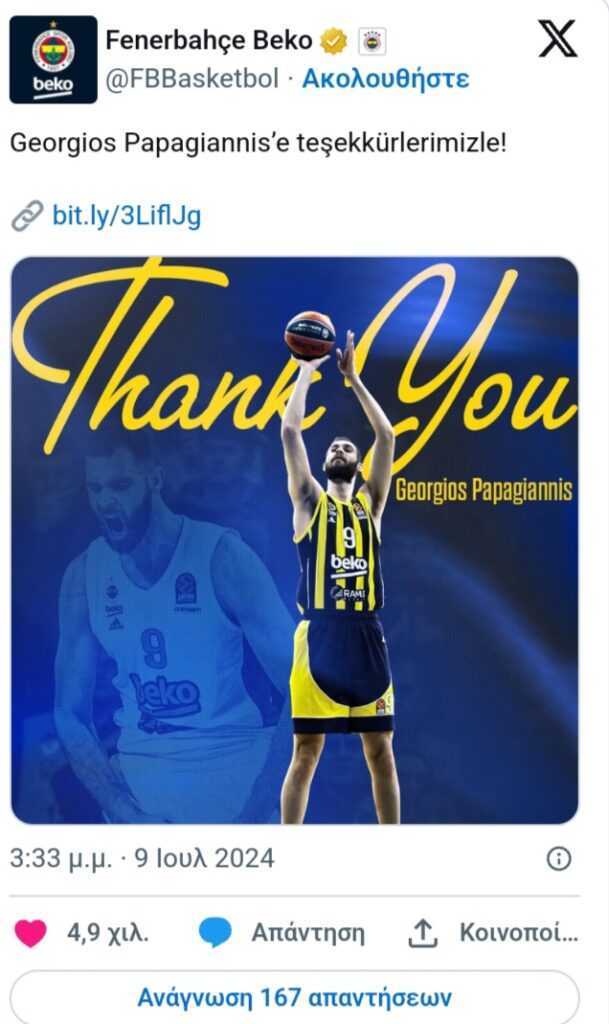 Η ομάδα της Τουρκίας ανακοίνωσε τη λύση της συνεργασίας της με τον Έλληνα σέντερ. Επόμενος σταθμός στην καριέρα του θα είναι η Μονακό, όπου θα έχει συμπαίκτη και πάλι τον Νικ Καλάθη.