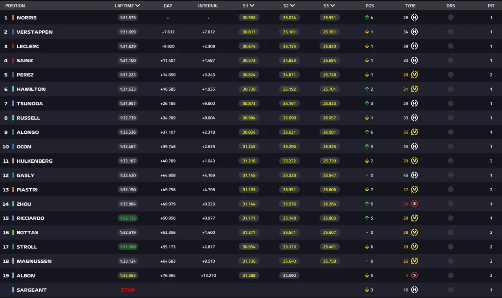 Ο Νόρις με άριστη οδήγηση και σωστή στρατηγική, τερμάτισε πάνω από 7 δευτερόλεπτα μπροστά από τον παγκόσμιο πρωταθλητή. Στο τρίτο σκαλί του βάθρου ανέβηκε ο Σαρλ Λεκλέρ, ενώ στην τέταρτη θέση ήταν ο Σέρχιο Πέρες, λόγω τιμωρίας του Κάρλος Σάινθ (5ος). Τη βαθμολογούμενη δεκάδα συμπλήρωσαν οι Λιούις Χάμιλτον, Γιούκι Τσουνόντα, Τζορτζ Ράσελ, Φερνάντο Αλόνσο και Εστεμπάν Οκόν.
